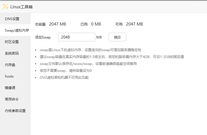 IT知识 宝塔Linux面板设置Swap虚拟内存降低内存使用率及负载方法 2025-11-09 0 129 0 Share 宝塔面板可以通过设置Swap/虚拟内存的方式来降低内存使用率和负载,使用宝塔面板的Linux工具箱即可设置虚拟内存。 选择左侧栏“软件商店”--“系统工具”,找到“Linux工具箱”。 点击Linux工具箱右侧的安装,宝塔面板会自动安装。 安装好后,点击“设置”,在Linux工具箱窗口点击“Swap/虚拟内存”, 如果你的宝塔Linux面板运行的MySQL数据库经常停止,导致网站无法连接数据库,那么建议设置虚拟内存提高宝塔面板运行的稳定性。 0